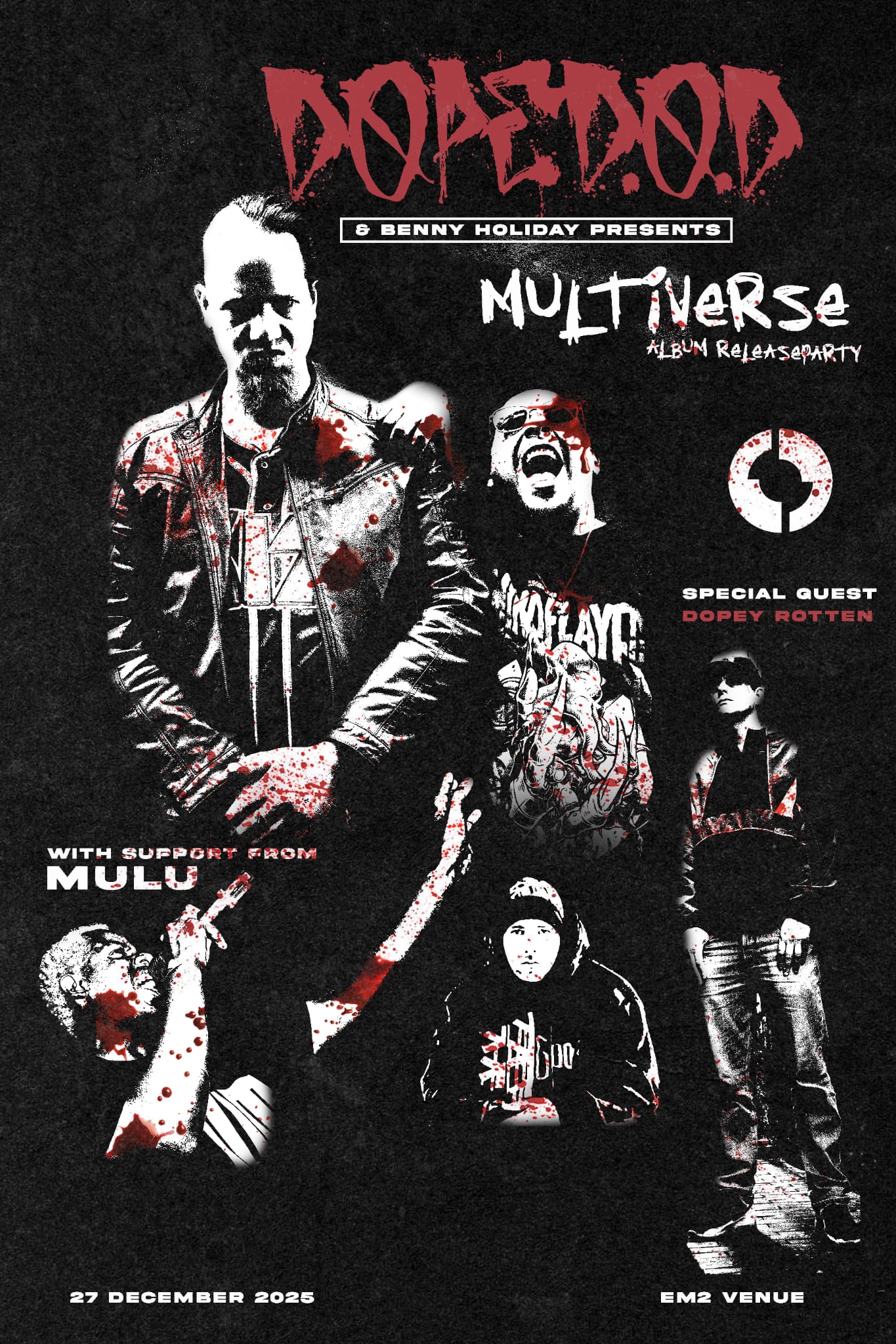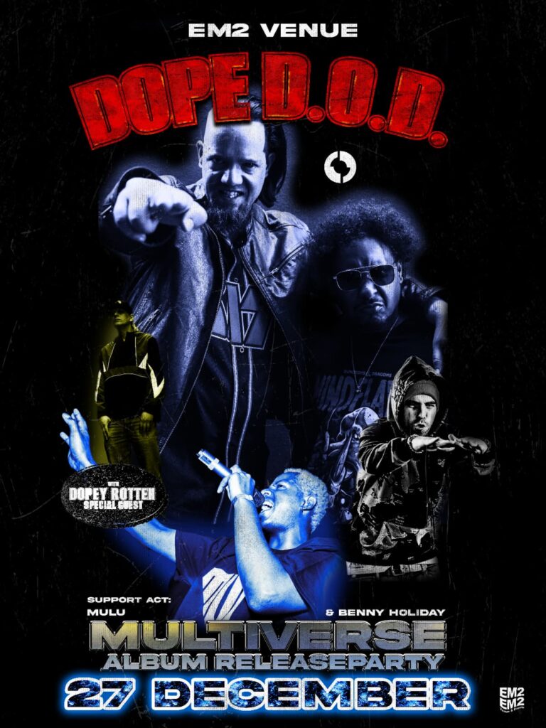 Kom stampen op 27 december tijdens de Dope D.O.D. Multiverse Release Party! De hiphopgroep uit Groningen boekte al ver over de grenzen successen, nog voordat ze in eigen land werden opgepikt. De rappers toerden de wereld rond in het voorprogramma van Limp Bizkit en Korn, en maakten daarbij meerdere continenten onveilig. Nu keren ze terug naar EM2 voor de release van hun nieuwe plaat!